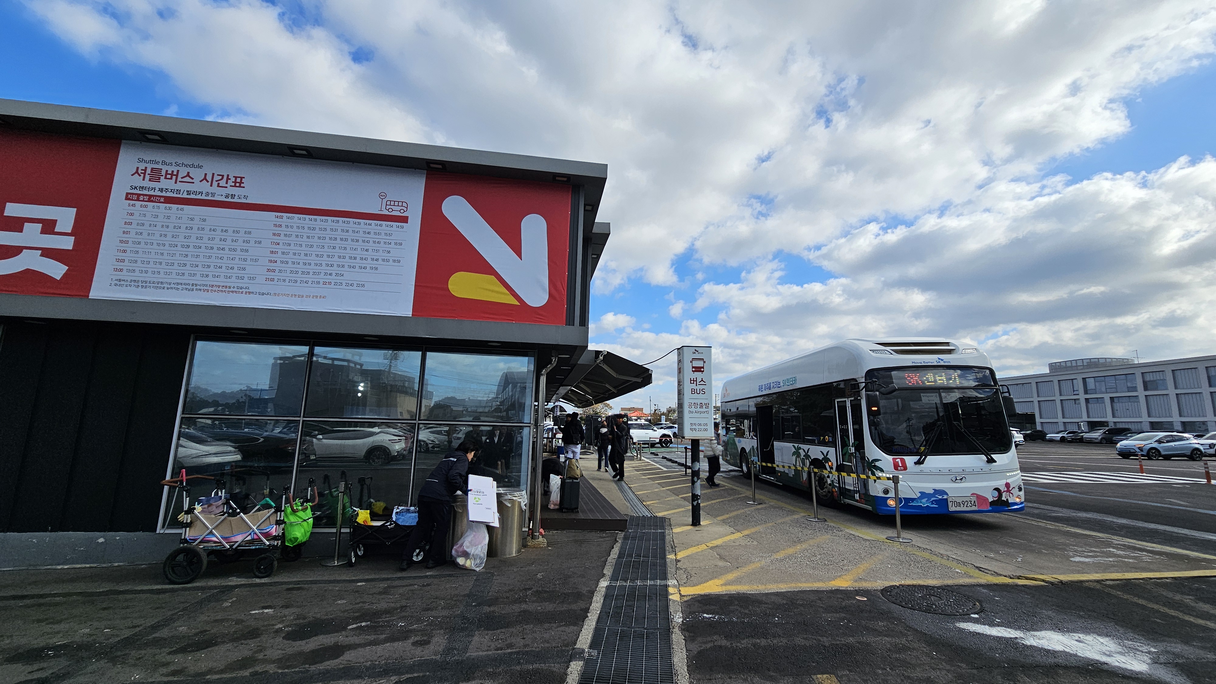 제주공항에 도착하면 렌트카를 바로 받는 게 아닙니다. 공항 5번 게이트 근처 셔틀 정류장에서 업체별 셔틀버스를 타야 합니다. SK렌터카 셔틀버스는 수시로 운행되며, 10분 정도 이동하면 렌트카 수령장에 도착합니다.